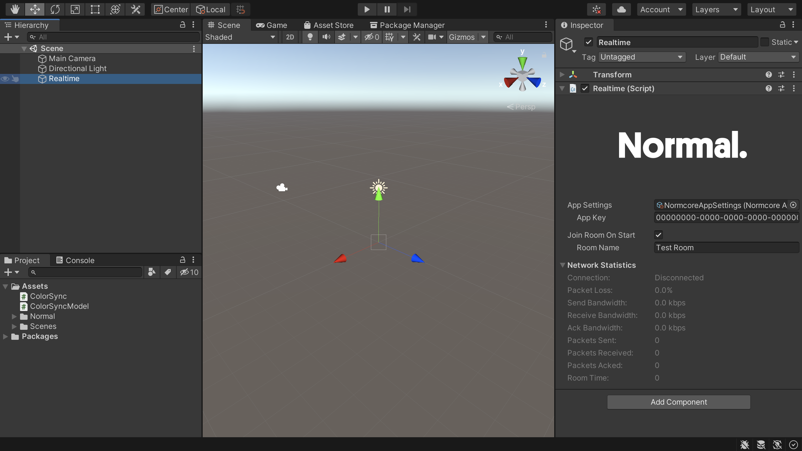 Open up a blank scene in Unity and add a game object with a Realtime component to it. Make sure to enter your App Key.